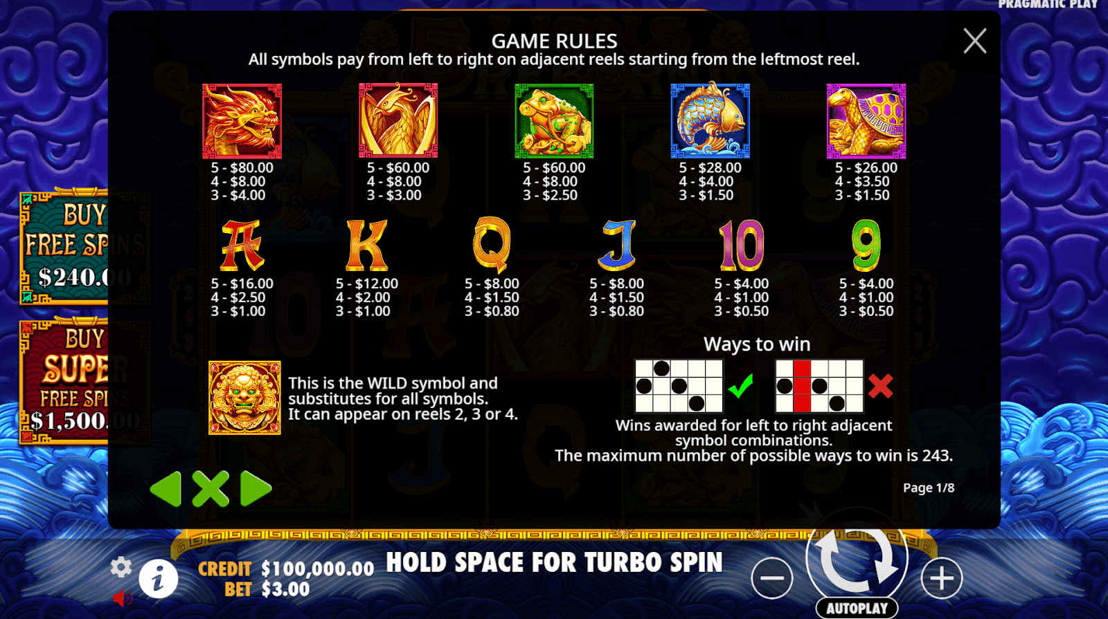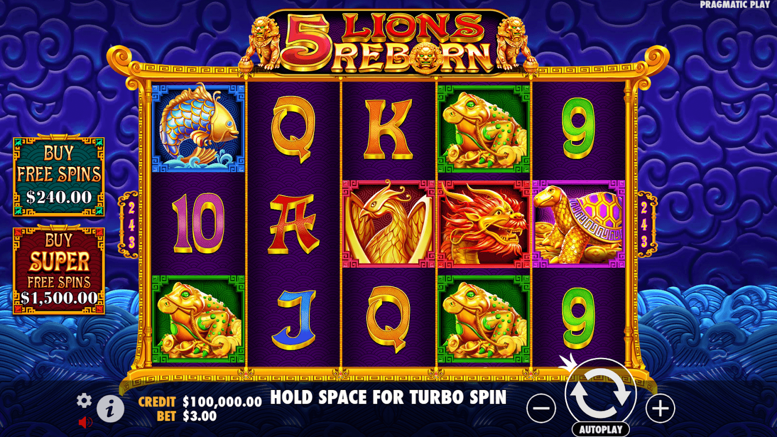 5 Lions Reborn, utviklet av Pragmatisk spill, er en fengslende spilleautomat med høy volatilitet som inviterer spillere inn i et mytisk jadetempel som yrer av gyldne dyr. Den spinner på et 5 × 3-rutenett med 243 måter å vinne på, en generøs RTP på 96,50 % og innsatser fra €0,30 til €240. Turbo og 1–1000 autospinn holder tempoet høyt, mens et Feature Buy (80 × for standard gratisspinn eller 500 × for supergratisspinn) gir umiddelbar adrenalin. Spenningen i grunnspillet kommer fra stablede premiumsymboler og dragewilds som har tilfeldige multiplikatorer på 2–35 ×.