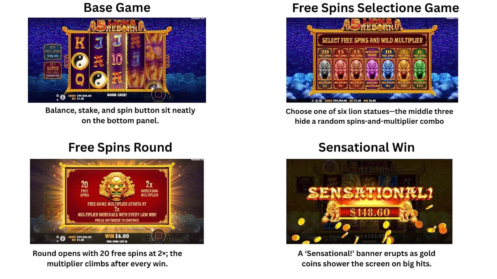 5 Lions Reborn har rik, detaljert grafikk sentrert rundt et jadetempelbakteppe, hvor føniks-, skilpadde- og koi-symboler glitrer i utsmykket gullfiligran. Subtile partikkelflammer og lysutbrudd gir en polert, dynamisk følelse uten å overdøve den tradisjonelle kinesiske estetikken.